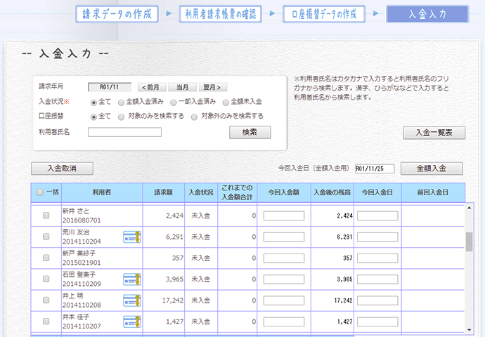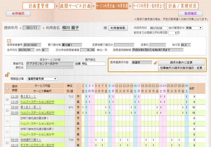 トップページ 機能紹介 機能紹介 現場の声を取り入れた豊富な機能をご用意しています! 対応サービスを選んでいただくと、対象の機能がご確認できます。※ 掲載している機能は一部です。 機能一覧 訪問介護 訪問入浴介護 訪問看護 訪問リハビリテーション 通所介護 通所リハビリテーション 福祉用具貸与 居宅療養管理指導 居宅介護支援 夜間対応型訪問介護 認知症対応型通所介護 小規模多機能型居宅介護 定期巡回・随時対応型訪問介護看護 認知症対応型共同生活介護 地域密着型通所介護 高齢者住宅 障がい福祉サービス 機能一覧 訪問介護 訪問入浴介護 訪問看護 訪問リハビリテーション 通所介護 通所リハビリテーション 福祉用具貸与 居宅療養管理指導 居宅介護支援 夜間対応型訪問介護 認知症対応型通所介護 小規模多機能型居宅介護 定期巡回・随時対応型訪問介護看護 認知症対応型共同生活介護 地域密着型通所介護 高齢者住宅 障がい福祉サービス 機能一覧 計画/実績 SmaCare(スマケア)連携 音声入力 要介護認定一次判定シミュレーション アセスメントシート/かんたんアセスメントシート モニタリング表 計画書作成/管理 独自サービスの設定・計画立案 計画書ファイル管理 計画/実績・請求状況管理 課題整理総括表 評価表 スタッフスケジュール管理 スタッフスケジュール確認/メール通知 ヘルパー給与計算 月間計画実績一括コピー/出力 サービス利用計画/利用実績 請求関連 AI(人工知能)Q&Aサポート 利用料口座振替データ作成 利用者請求 国保連合会伝送サービス 国保連請求 利用者請求・売上・回収管理 利用者請求 HOME画面 請求処理ナビゲーション 審査・支払い結果確認 国保連請求 介護記録 介護記録 基本情報 利用者情報 保険外サービス情報 福祉用具商品情報取込 帳票出力 帳票テンプレート 各種データダウンロード アプリ iPad専用アプリ「介護支援経過記録」 iPhone専用アプリ「スタッフ実績報告」